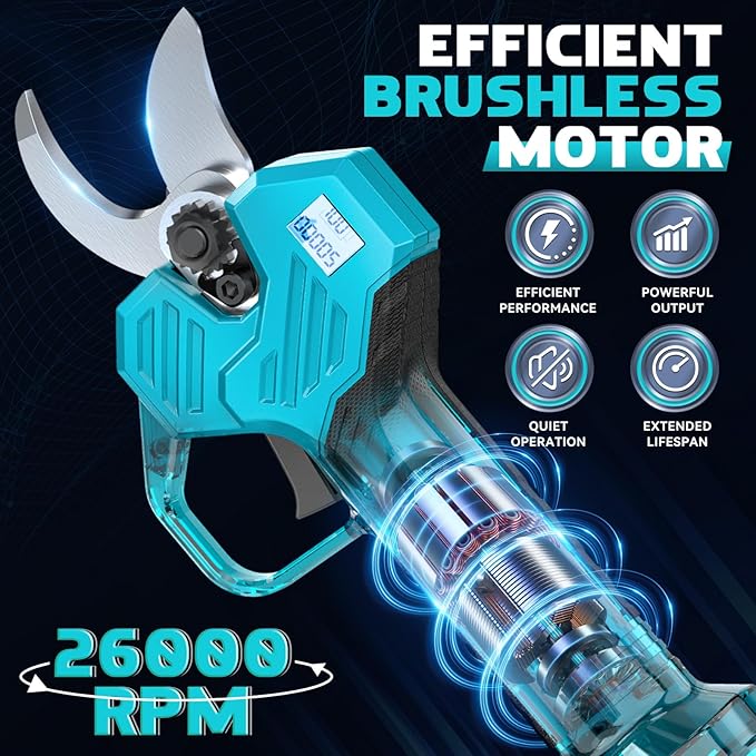 • Safety and Convenience: Equipped with a built-in safety lock mechanism, the portable pruning shears require a quick trigger press sequence to activate, preventing accidental start-ups. The lightweight design and LCD digital display for battery monitoring make every pruning task a breeze.
