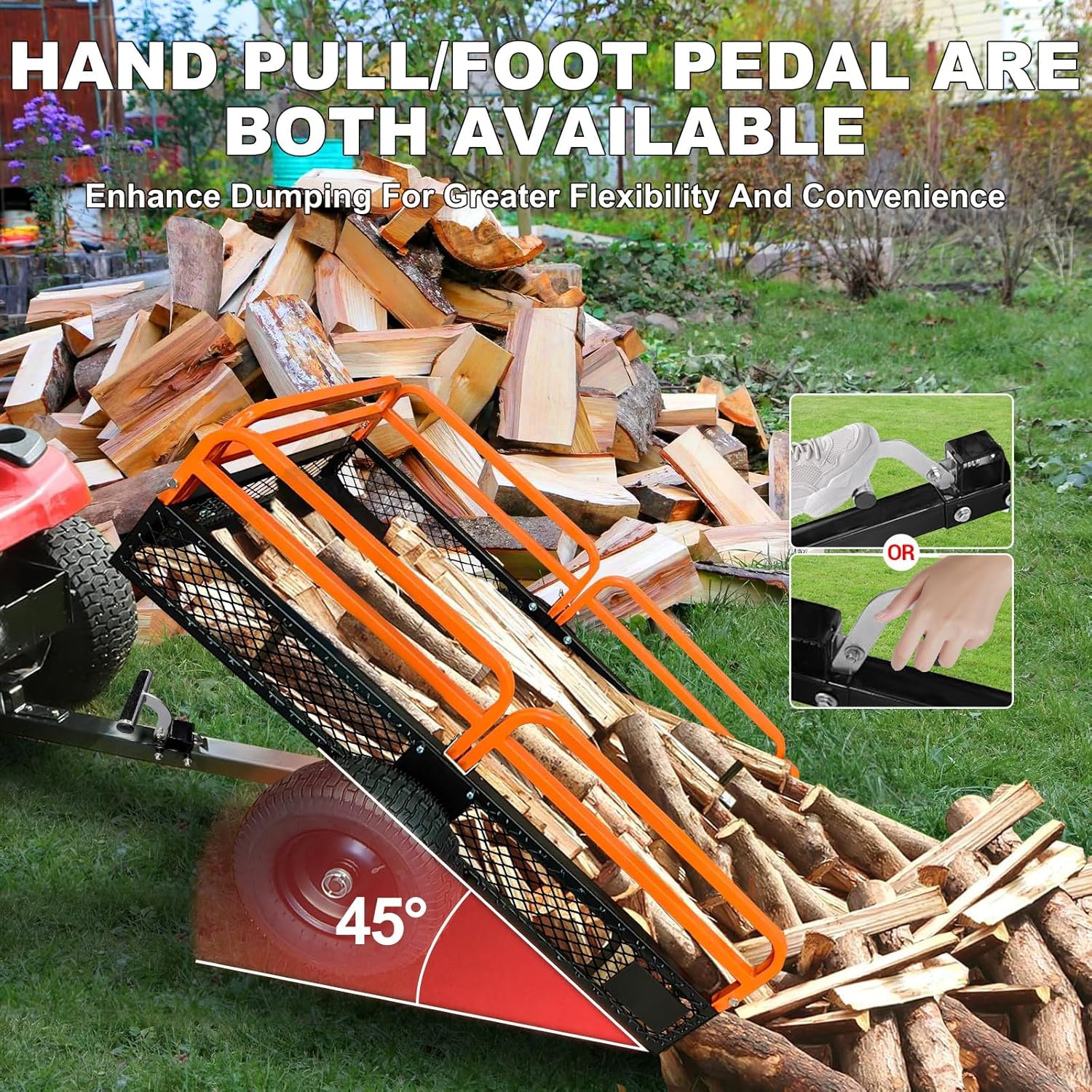 • 【All-Terrain Dump Cart Mobility】 Equipped with dual sealed bearings and 16" pneumatic tires, the Dump Cart maintains smooth maneuverability over gravel, mud, and slopes. The anti-slip steel deck securely holds tools and firewood during challenging farm or landscaping tasks.