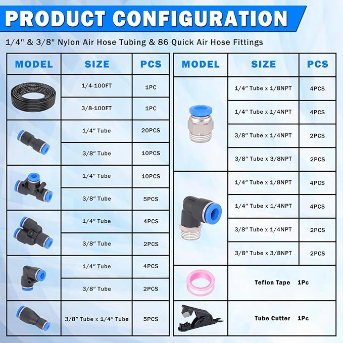 • 【90 PCS PACKAGE】- The 90 pcs air line fittings kit include 1 roll 100 ft 1/4" DOT air line, 1 roll 100 ft 3/8" DOT air line, 35 pcs straight union connectors, 15 pcs tee unions, 6 pcs 90° elbow unions, 6 pcs Y-splitter unions, 12 pcs straight push&NPT connectors, 12 pcs 90° elbow push&NPT connectors, 1 pc tube cutter, 1 pc Teflon tape. Quick connect Air line fittings types: 1/4", 3/8".