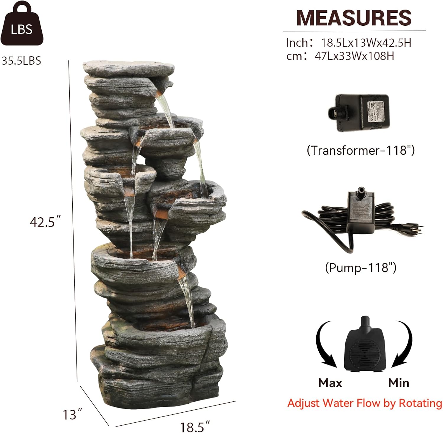 • 【Garden Fountain Information & Care】18.5"L x 13"D x 42.5"H Material: UV-stable resin Includes: Pump, LED lights.Pro Tip: Place on a level surface near a power outlet for optimal performance!
