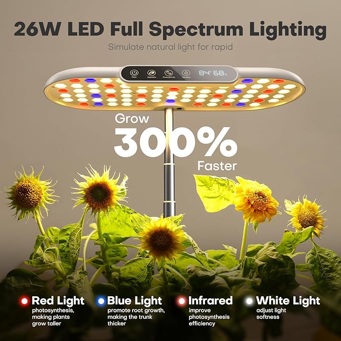 • 17.3in adjustable full-spectrum Led grow liht: indoor growing system with 2 smart modes and automatic day/night switching protects tall plants from light burn by extending the grow lamp to 17.3 inches; professional LED Grow Lights mimic natural light with 16-hour on/8-hour off, and a one-button "Vegetable Mode" (optimized for greens) and “Fruits Mode” (for fruits/flowers) increase plant growth by up to 30% with spectral adjustments. Advanced Indoor Hydroponics.