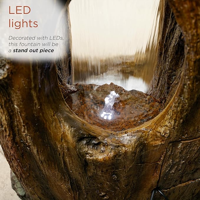 • THREE-TIER WATERFALL FOUNTAIN: Enhance your outdoor space with the Alpine Corporation 59" 3 Tier Waterfall Tree Trunk Fountain. This stunning cascading water feature adds a tranquil ambiance, perfect for any garden, patio, or lawn décor. LED lights illuminate the water's flow, creating a serene visual effect.