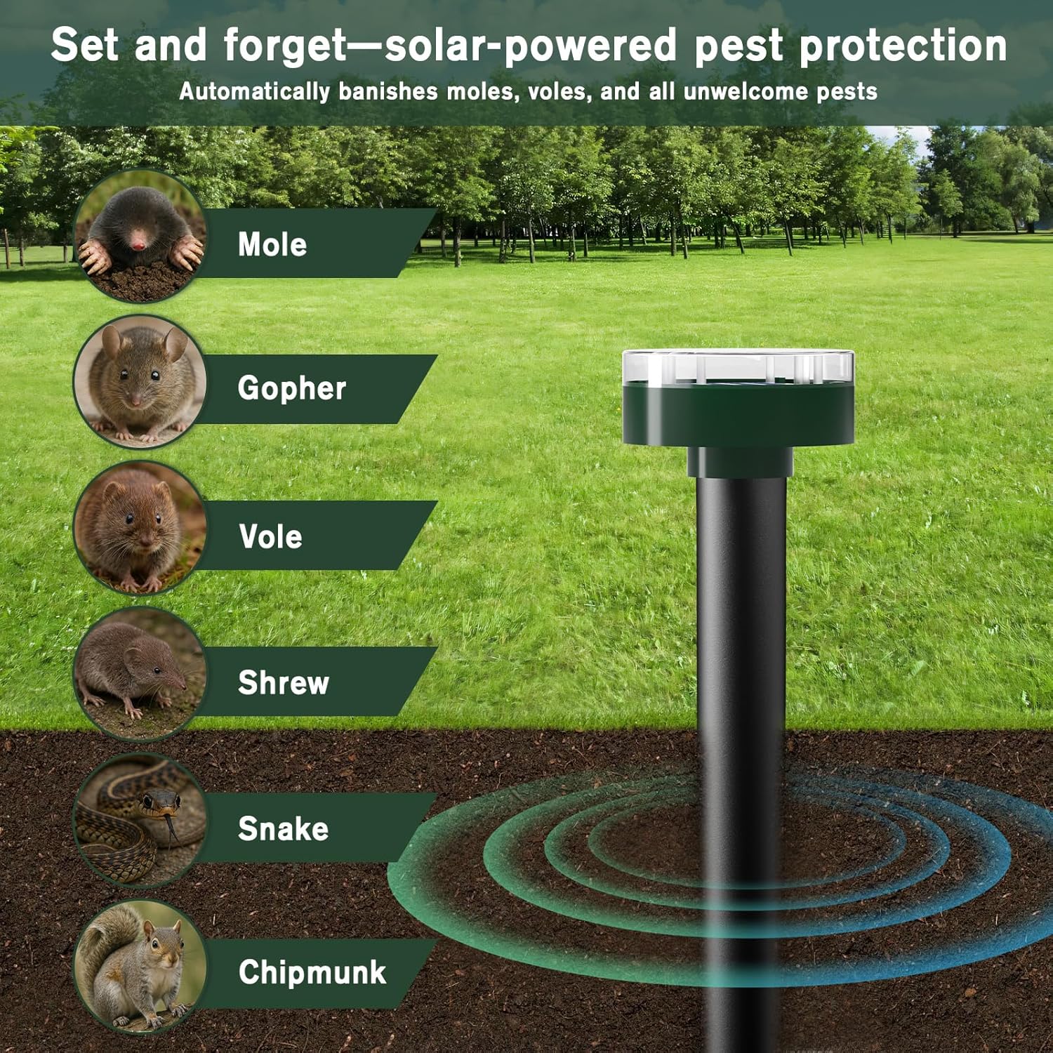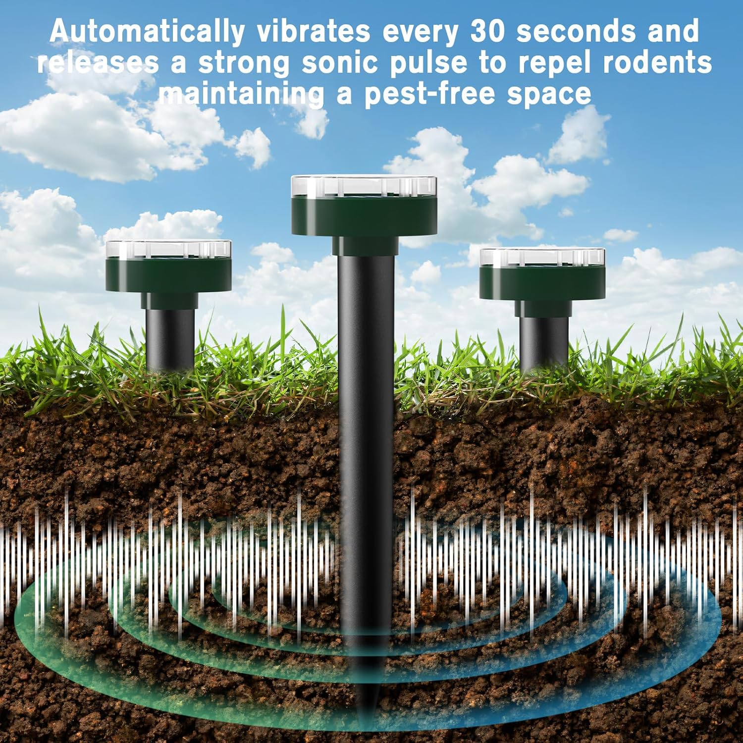 • Quick Installation: Simply insert the sonic mole deterrent spikes into the ground and press the ON button. Ideal for gardens, farms, and yards—no maintenance required after setup.