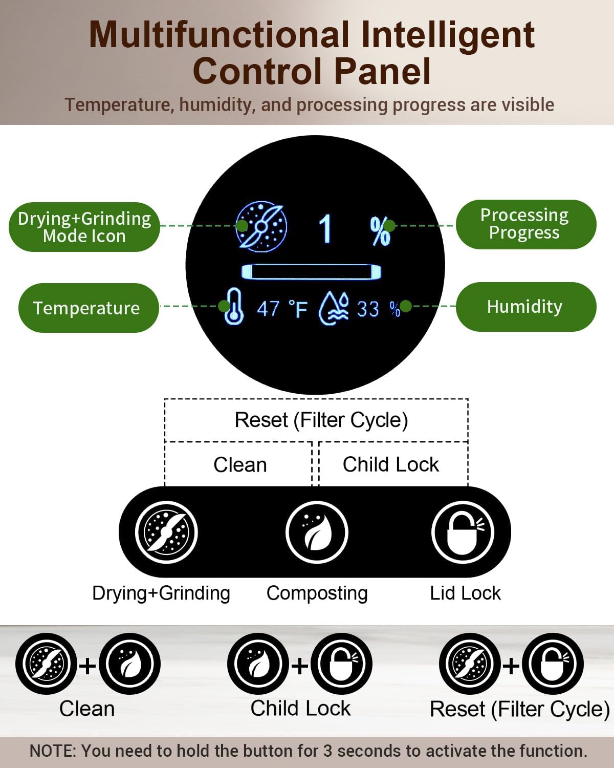 - ✅Smart, Quiet, and Energy-Efficient: The countertop compost bin features a large LED screen that displays temperature, humidity, and processing progress. Smart sensors automatically optimize processing time and power for efficiency. Operating at under 45 decibels, it runs quietly, even during off-peak nighttime hours, allowing you to save on electricity costs while enjoying a peaceful environment.