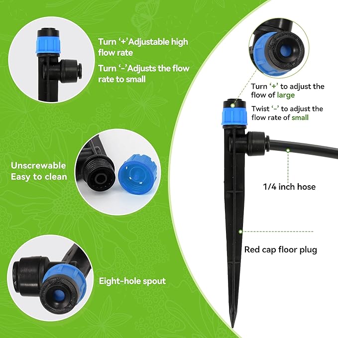 • ๐ŸŒฑใ€Easy to Operateใ€‘Put the 1/4 inch irrigation tubing through the lock and connect it to the barb on the side of the irrigation, and turn the lock to fix the connection๏ผŒthen rotate the cap to adjust the water flow according to the needs of different plants, and guide the water precisely to the place where it is needed, saving your energy and water resources