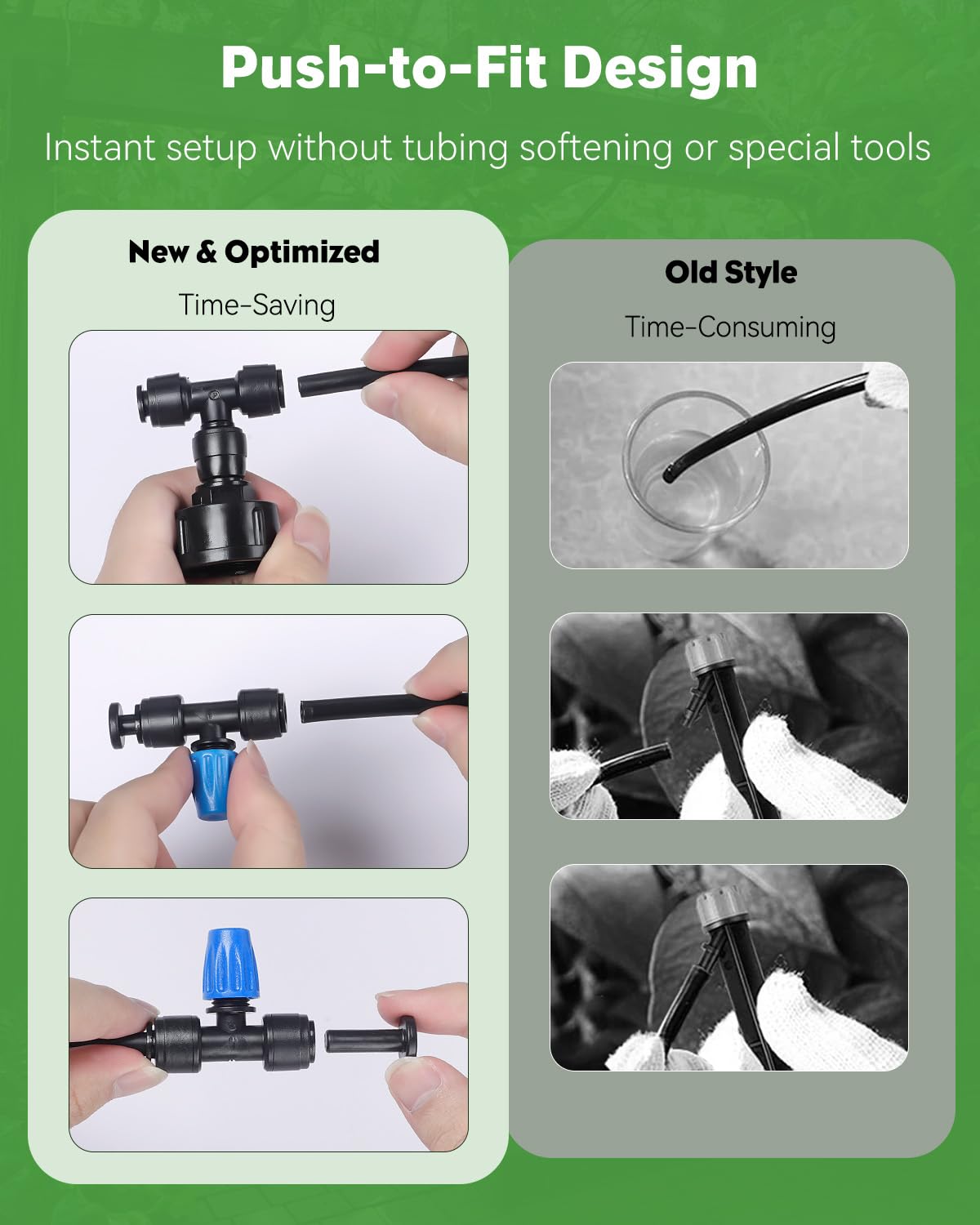 • Push-to-Fit Design: No tubing softening or special tools required! Simply push the tubing into the inlets of the misting nozzles or connectors for instant setup. To disconnect, just press the collar. Saves 80% setup time over traditional systems.