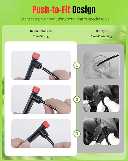 • Push-to-Fit Design: No tubing softening or special tools required! Simply push the tubing into the inlet of the drip irrigation emitter, then insert it into the soil. To detach it, just press the inlet and pull out the tubing. (NOTE: Tubing Not Included!)