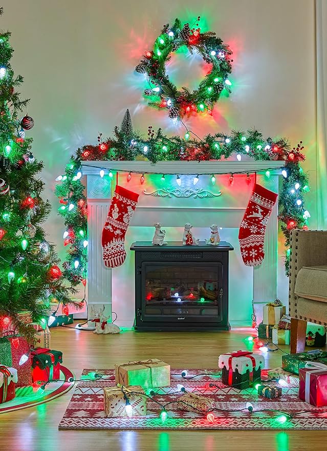 • Super Long Vintage C9 Christmas Lights: This 114FT C9 LED Christmas light string features 150 Red and red green and pure white bulbs, each bulb is spaced about 8 inches apart across a 98-foot lighted strand with extra 16-foot leading wire(Total length 114 ft), perfect for creating a cheerful holiday atmosphere. The classic faceted C9 shape revives nostalgic Christmas charm for rooftops, trees, porches, fences, and more