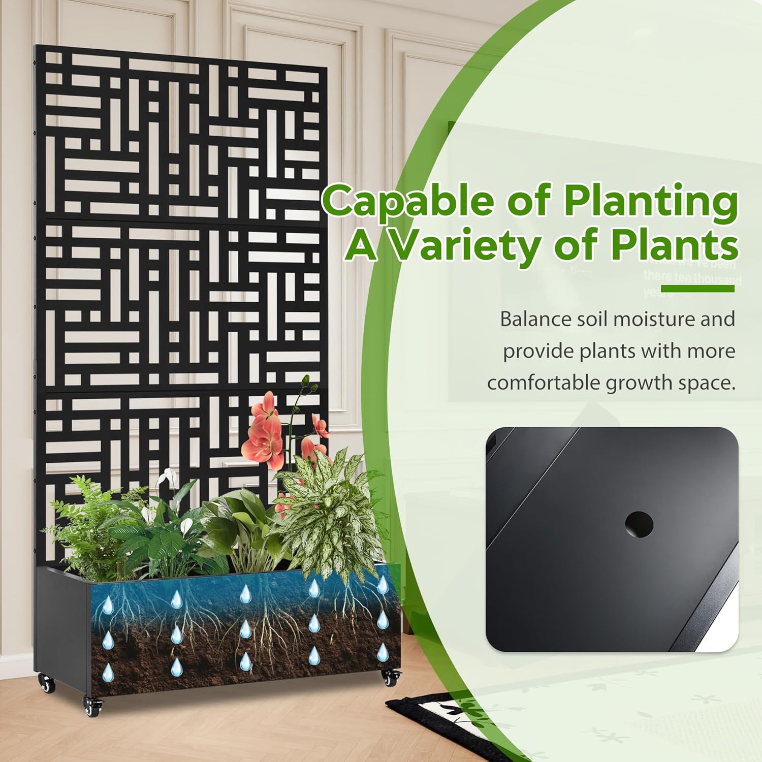 Metal Planter Box with Trellis,71”Raised Garden Bed with Trellis Privacy Screen and Drainage.Wheeled for Patio Flexibility,for Climbing Veggies/Flowers.DIY-Friendly Design
