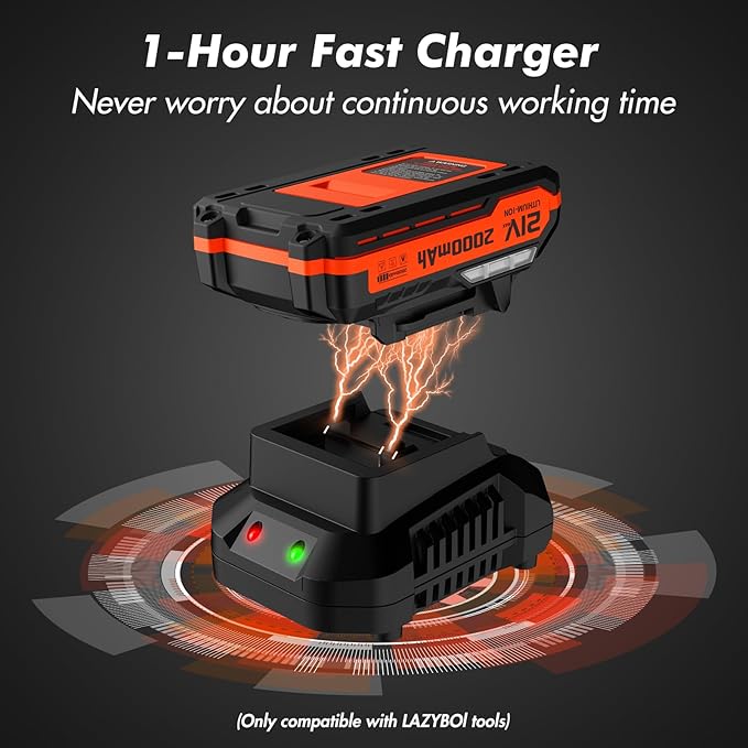 - Effortless Charging and Operation - Fed up with lengthy battery charging times? Experience the convenience of rapid 1-hour charging with our cordless leaf blower. Its LED indicator signals red during charging and green when fully charged. Equipped with a fast charger and two 2.0Ah 21V batteries, it offers 30 minutes of low-speed mode and 20 minutes of high-speed mode (Two batteries fully charged working time) making your work easier