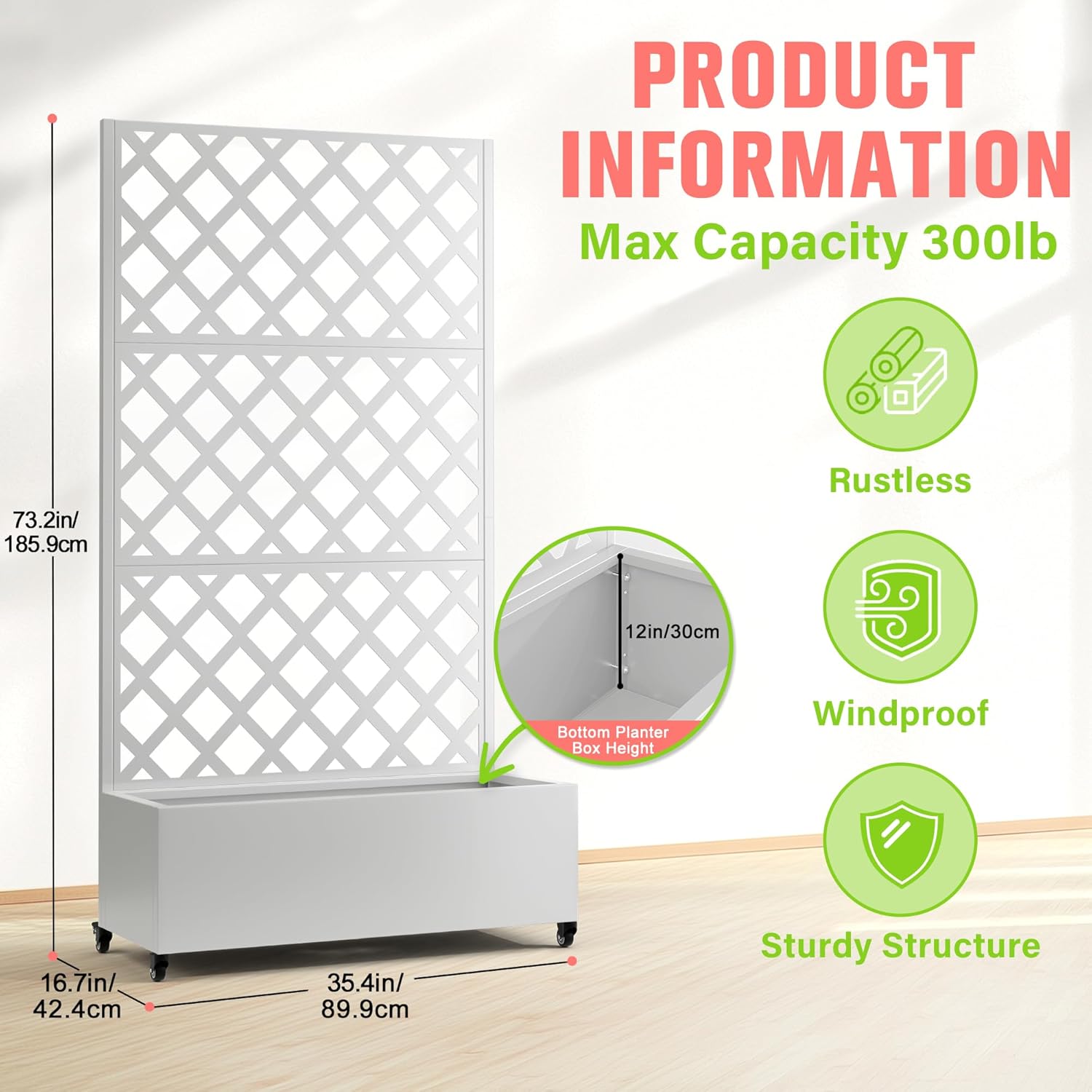 Metal Planter Box with Trellis, Raised Garder Bed with Drainage Hole, Privacy Screen & Trellis for Climbing Plants, Outdoor Plant Stands, 35''L×17''W×73''H, White