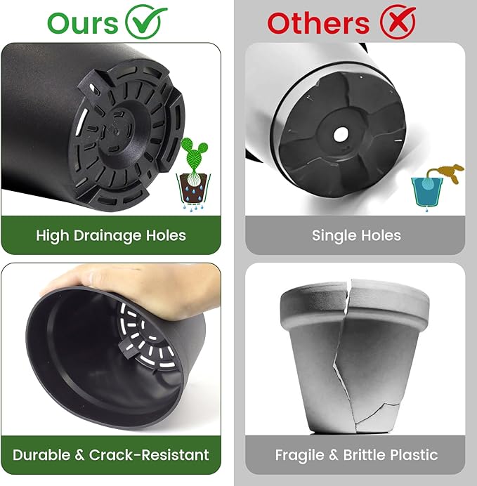 • [Durable Construction with Functional Size] Each pot measures 6x6x5 inches, providing ample space for herbs, succulents, and small houseplants while remaining compact enough for shelves, desks, and windowsills. Made from UV-resistant plastic, these plastic flower pots are built to withstand sunlight and weather exposure.