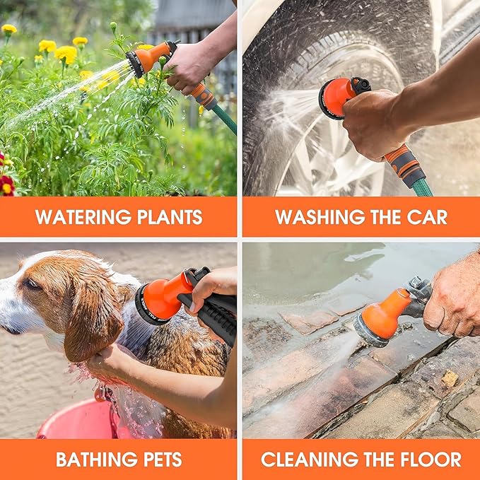 • High-Flow Nozzle & 9 Spray Patterns Versatile Power:Upgrade your watering efficiency with the ergonomic 9-function spray gun, offering modes from "mist" to "jet" for gardens, cars, and pets. The upgraded spring-loaded hose guide enhances water flow by 30%, while the anti-leak seal maintains consistent pressure. Includes a comfort-grip handle for portability .