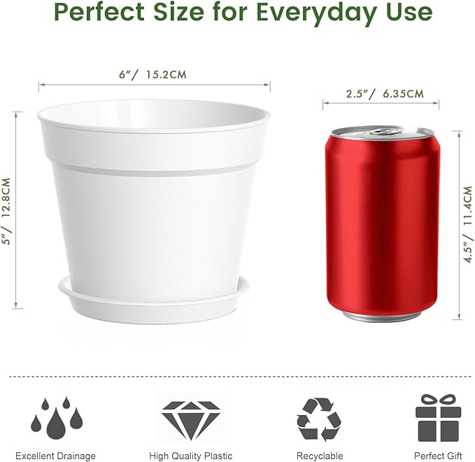 • [Durable Construction with Functional Size] Each pot measures 6x6x5 inches, providing ample space for herbs, succulents, and small houseplants while remaining compact enough for shelves, desks, and windowsills. Made from UV-resistant plastic, these plastic flower pots are built to withstand sunlight and weather exposure.