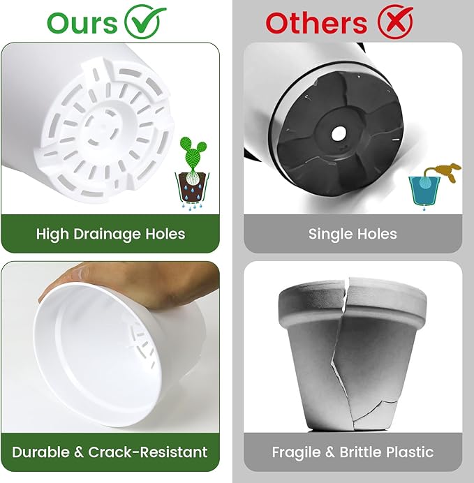 • [Drainage System Designed for Healthy Roots] These 6 inch plant pots feature multiple drainage holes at the bottom to promote airflow and prevent waterlogging. Matching saucers help catch excess water and reduce mess, making them ideal plant pots with drainage for both indoor and outdoor use.