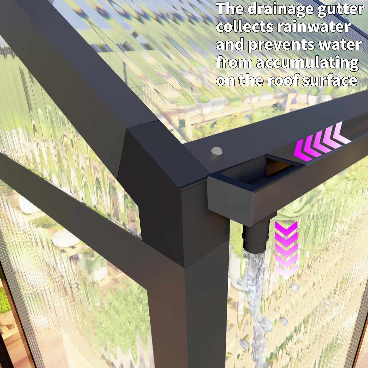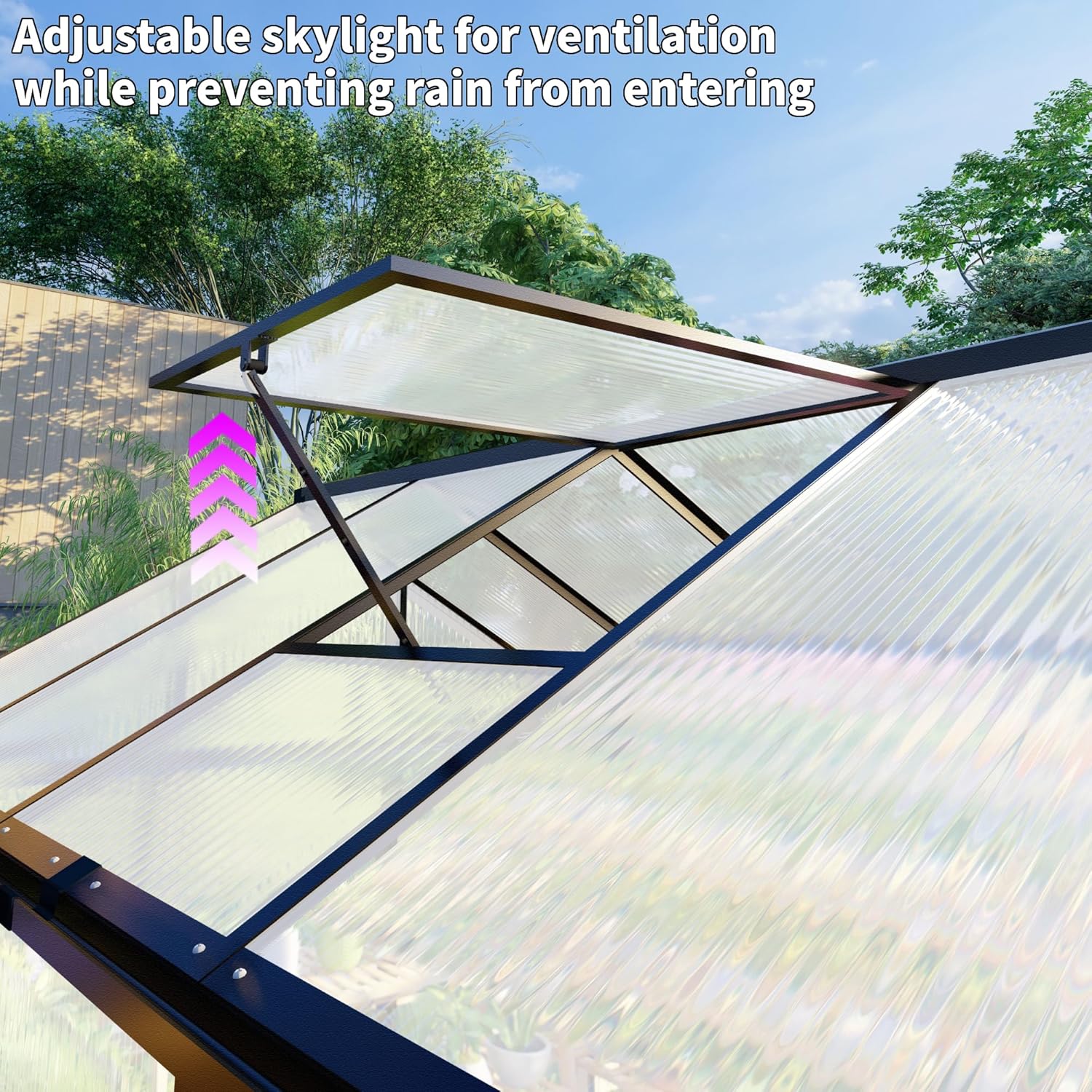 • POLYCARBONATE GREENHOUSE: Elevating humidity with superior insulation, transparent polycarbonate panels make our greenhouse ready for outside conditions. They allow in nourishing sunlight while still blocking scorching UV.