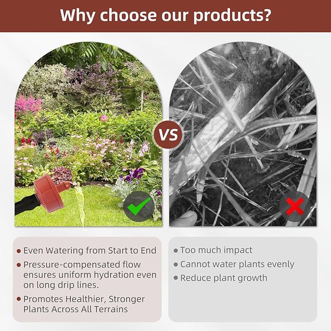 - Pressure Compensating Technology: Our pressure compensating irrigation spot drippers/emitters maintain a constant, steady 2 Gallon Per Hour(8L/H) water flow at 10-60 PSI. Whether on slopes, long lines, or uneven terrain, your plants will get the precise amount of water they need without the hassle of over- or under-watering. NOTE: Flow may appear fast, but the outlet is smaller than 1/4" tubing—ensuring true 2 GPH delivery. (NOTE: Fast-looking flow is visual; actual output is precisely 2 GPH.)