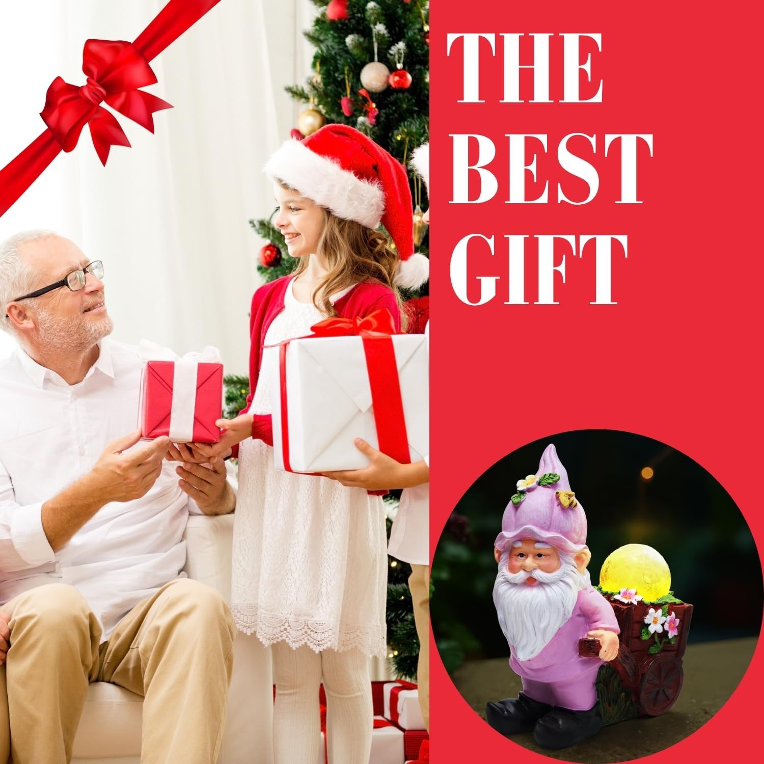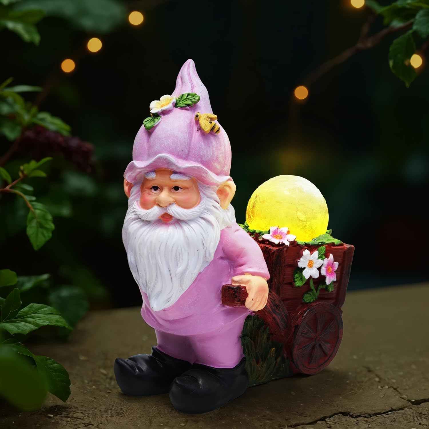 • Charming Gnome with a Magical Glow – Add a playful touch to your garden with this adorable pink gnome pulling a cart that carries a solar-powered crackle glass globe. It brings storybook magic and cheerful personality to any outdoor space.