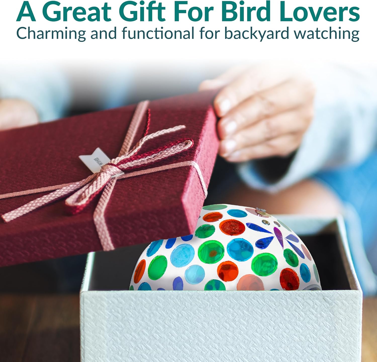 • ATTRACT BIRDS TO THE YARD: This cute bird feeder features vibrant colors and a mosaic glass construction that is sure to appeal to humans and birds alike. The bright colors and reflective material will help attract a variety of bird species to the feeder including cardinals, finches, sparrows, and more. Plus, it will add a stylish pop of color to any patio decor. The open fly-through design also makes it easier for birds to access the seed, encouraging them to come back again and again.