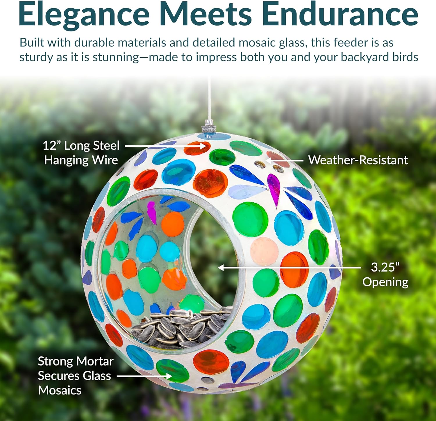 • EASY TO FILL: The 3.25" diameter opening can be accessed from two sides, making it easy to fill the glass hanging bird feeder with seeds. The small drainage hole in the bottom of the mosaic bird feeder helps to keep seed dry and prevent moisture from building up. The mesh tape placed over the hole allows moisture to drain without spilling the seeds. It holds approximately 1 cup of small birdseed blend. Please note that the amount of food may vary depending on the type of seed you use.
