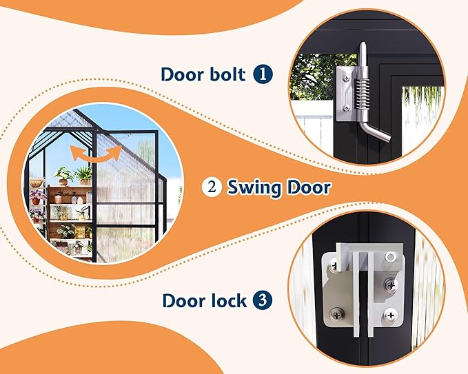 • Dual Top-Opening Windows for Ventilation: Equipped with two top-opening windows that open up to 160°, this sunroom allows optimal airflow and ventilation, helping regulate temperature and humidity to support healthy plant growth