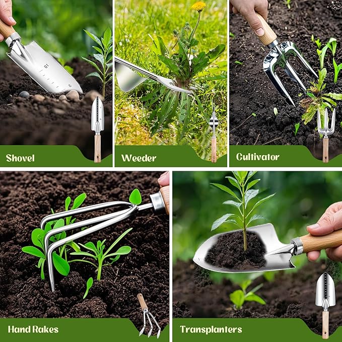 • 【Ergonomic Wooden Handle】In order to realize a more comfortable and effortless use experience, each tool has an ergonomic handle, making them super comfortable to use even for longer gardening sessions. These gardening tools for women men made things easy during digging, carrying, weeding, planting, and pruning. Each tool comes with a handy hanging hole on the handle makes them easy to be stored.