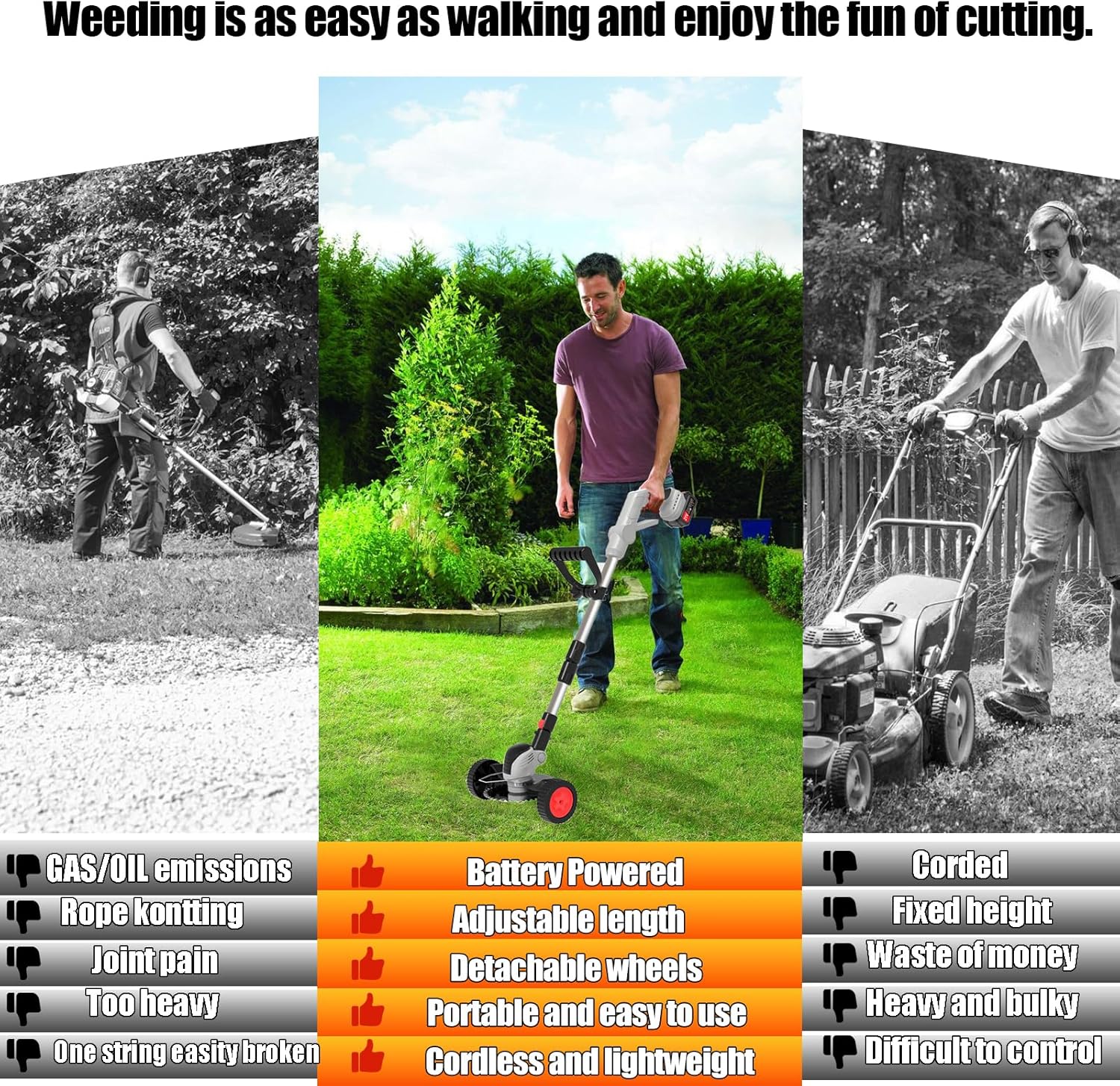 - 2025 UPGRADED ELECTRIC WEED WACKER: The cordless grass trimmer has been upgraded with smoother wheels, higher-strength blades and larger-capacity batteries.The multifunctional cordless electric weed wacker is versatile and can be used as grass trimmer, edger, lawn mower, easy for different cutting jobs, not limited by wires, you can mow anywhere. Weeding is as easy as walking and enjoy the fun of cutting.(fully charged before first use)