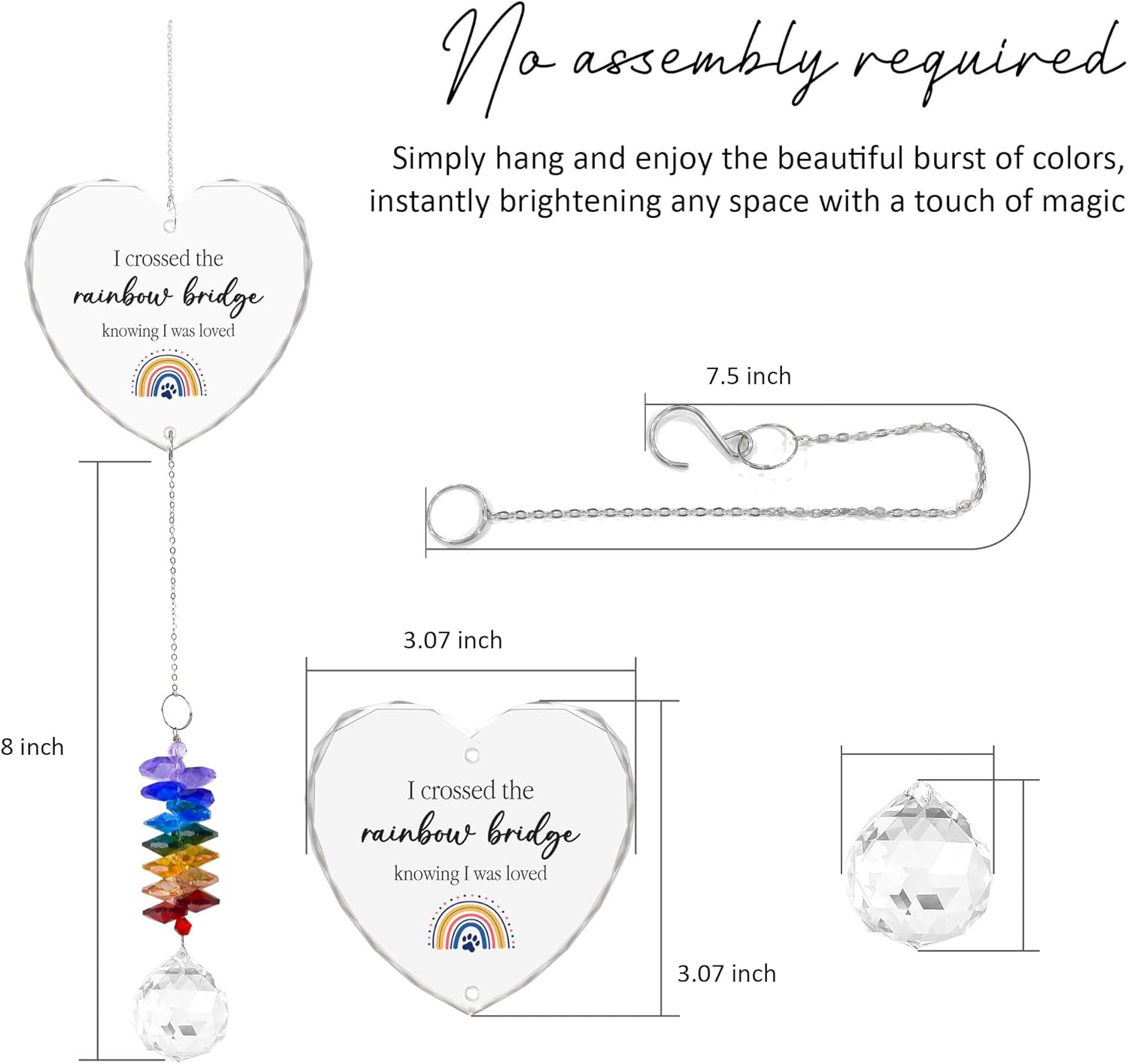 • ๐ŸŒˆ Emotional Tribute: This Pet Memorial Suncatcher features the touching message 'I crossed the rainbow bridge knowing I was loved', offering a heartfelt remembrance of a beloved pet. A truly sentimental Dog Memorial Ornament that brings comfort and reflection.