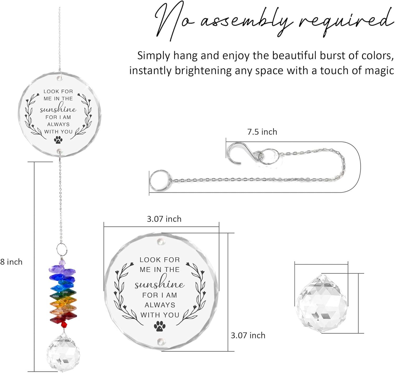 • ๐ŸŒˆ Emotional Tribute: This Pet Memorial Suncatcher features the touching message 'Look for me in sunshine. For I am always with you', offering a heartfelt remembrance of a beloved pet. A truly sentimental Dog Memorial Ornament that brings comfort and reflection.