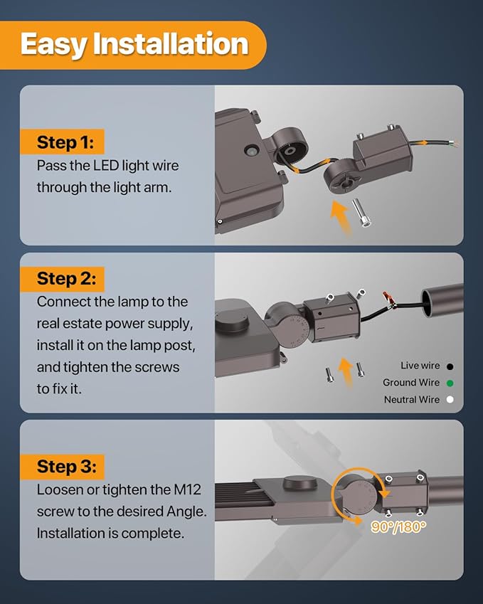 • Easy Installation & Wide Use – Designed for quick setup with the slip fitter mount—simply attach to the round pole, tighten screws, and connect wiring. Ideal for parking lots, church, walkways, stadiums, farms, building exteriors, and more