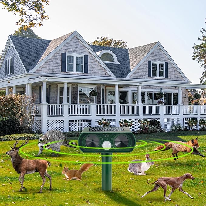• Ultrasonic Animal Repeller Outdoor: The deer deterrent devices outdoor have a 110-degree angle and an effective distance range up to 33 feet. It can effectively drive away squirrels, raccoons, rabbits, cats, dogs, skunks, foxes and other animals to protect your plants, flowers, gardens and other properties