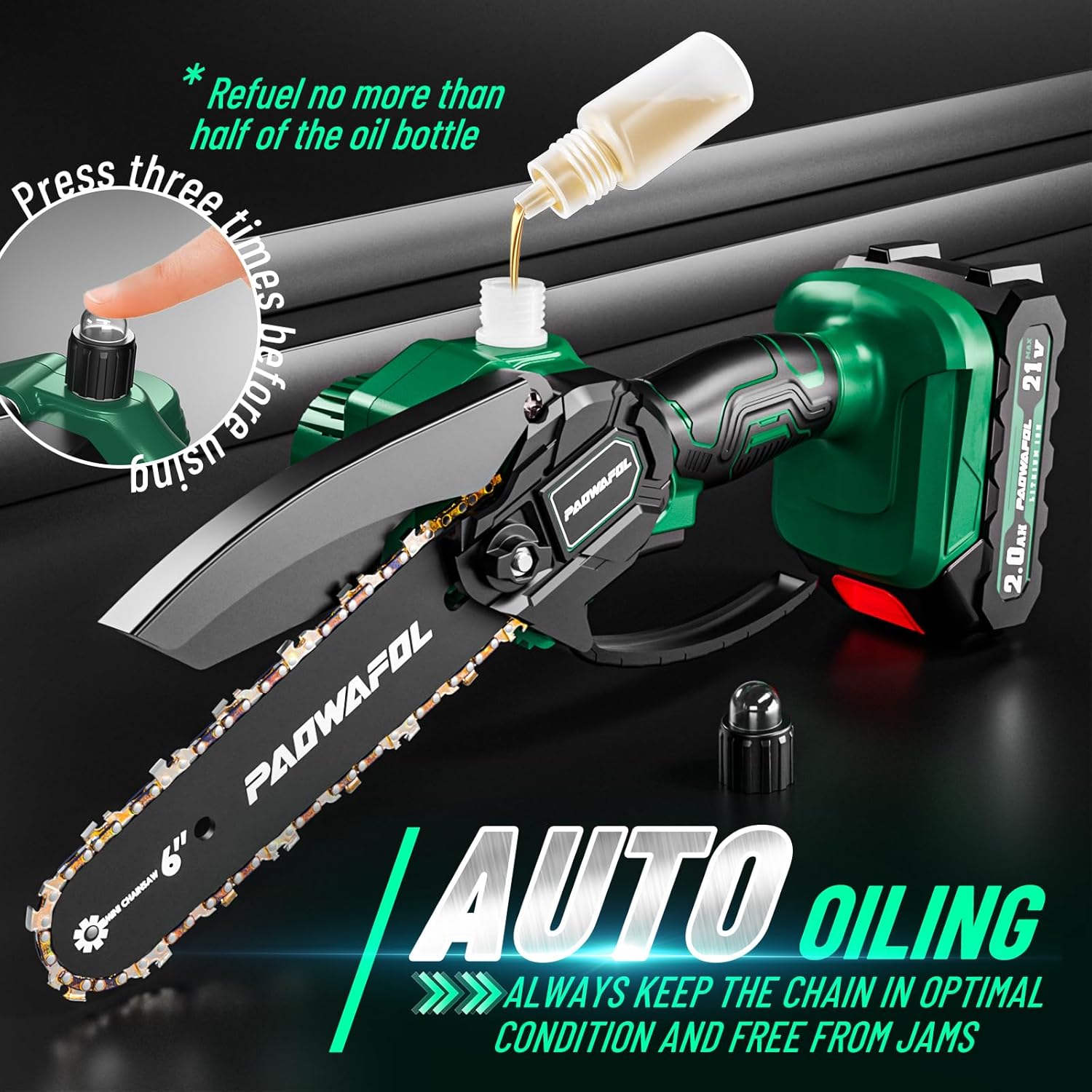 - Automatic-Oiling & Tool-Free Installation: Say goodbye to any tedious tools! The unique Automatic Oiling on battery chainsaw is extremely easy to operate. After pouring oil (not exceeding 30ml) into the machine, tighten the lid and press it 3-5 times to start cutting. Meanwhile, this self-adjusting mode design of the mini chain saw not only makes installation easy, but allows you to easily replace and adjust the tension of the chain (just tighten the green circular gear cover on the machine)