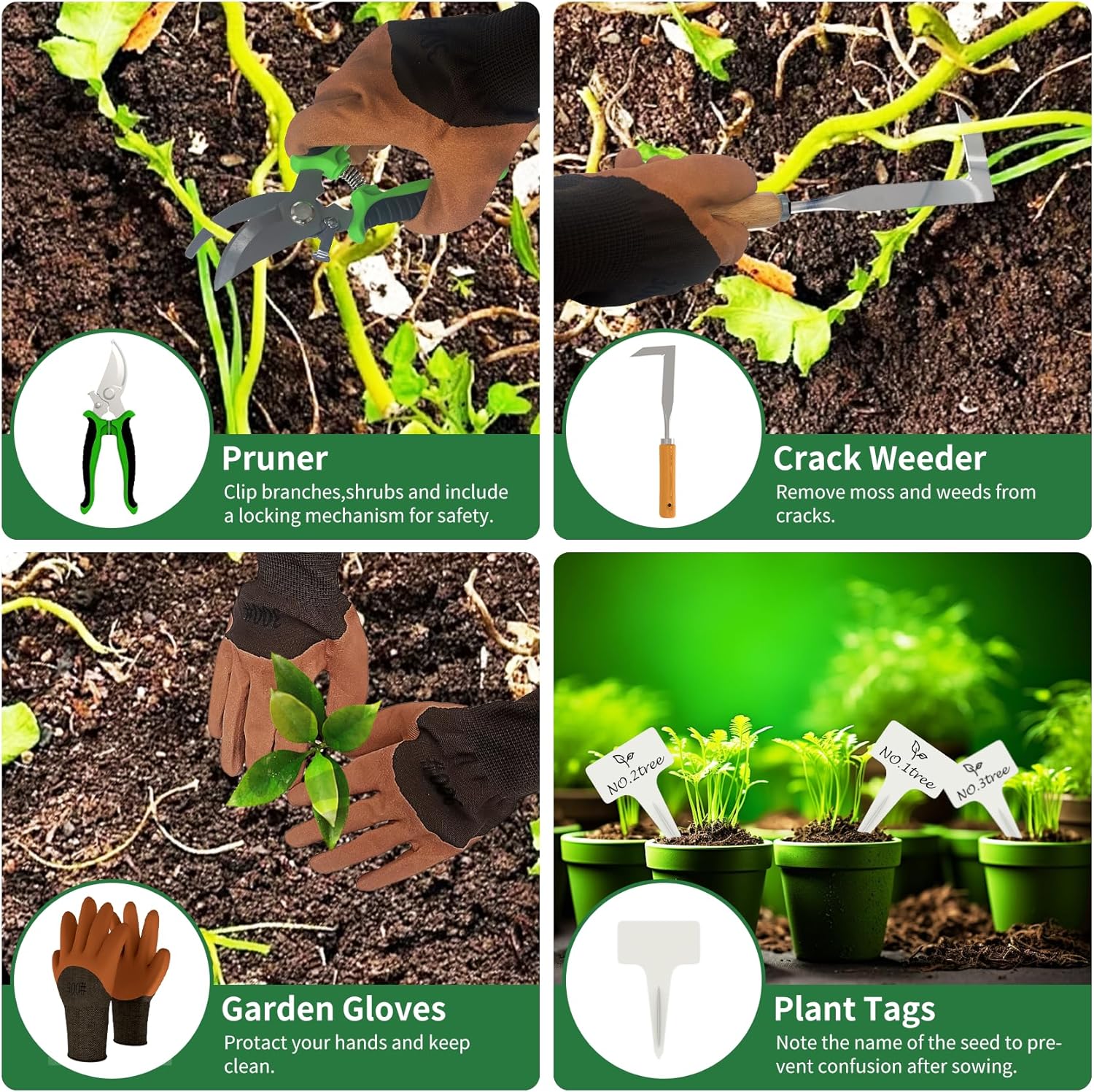 • 【20-Piece Complete Gardening Tool Set】- This all-in-one gardening kit includes a Large Garden Trowel, Transplanting, Crack Weeder, Hand Rake, Hand Weeder, Pruner, a pair of Gardening Gloves, 12 Plant Tags, and a Garden Tool Organizer Bag. Each tool features a convenient hanging hole for easy organization, keeping your garden tools neatly stored and ready for use.