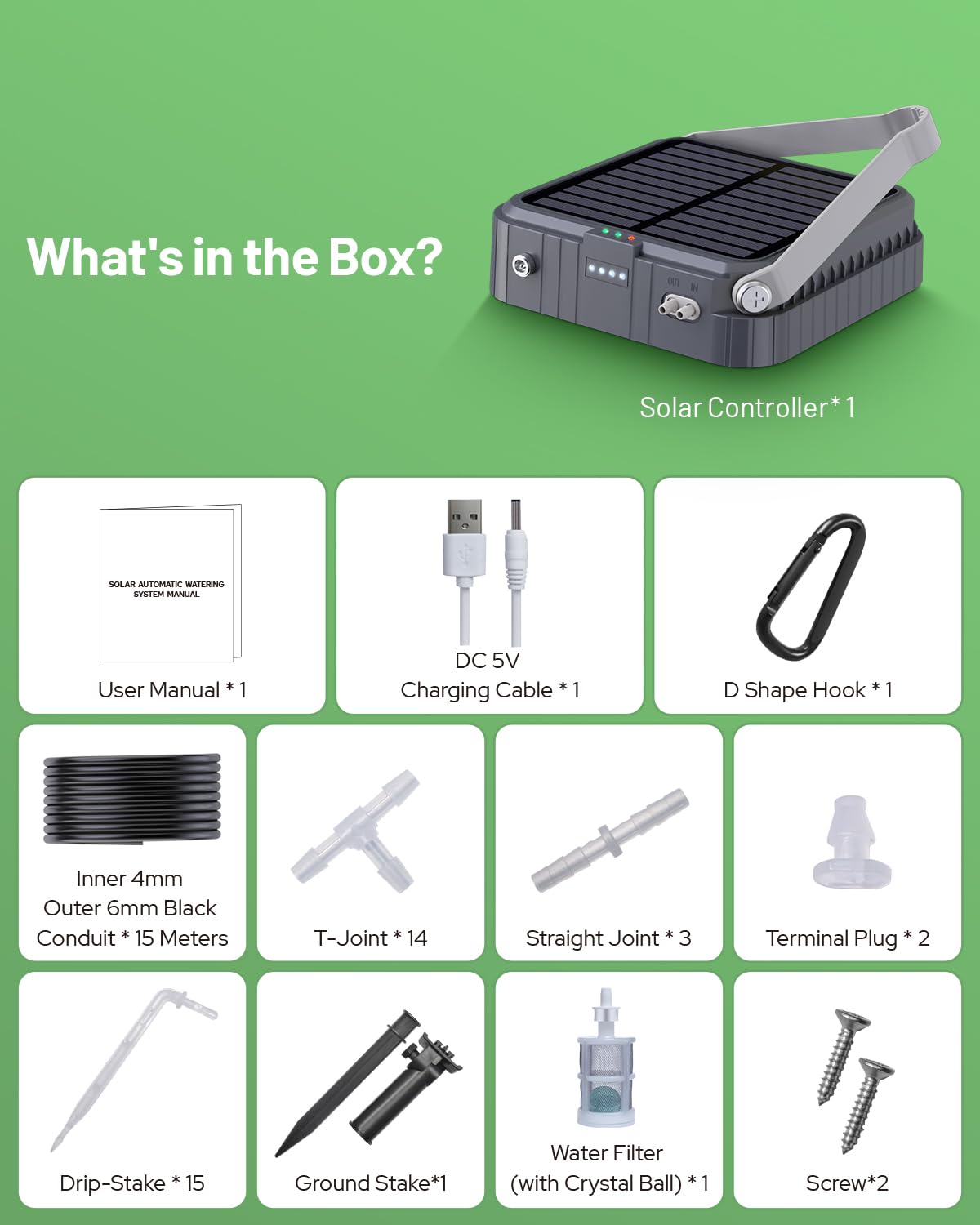 • ๐ŸŒปEffortless Watering Solution๐ŸŒป Our automatic watering system offers three placement options, perfect for balconies, terraces, and small gardens lacking access to a faucet or fixed power source. โœ…No Worry for Power Supplyโœ… Equipped with visual battery indicators, the system can be charged via external power when solar energy is insufficient. Its high-capacity battery ensures up to 30 days of consistent watering.