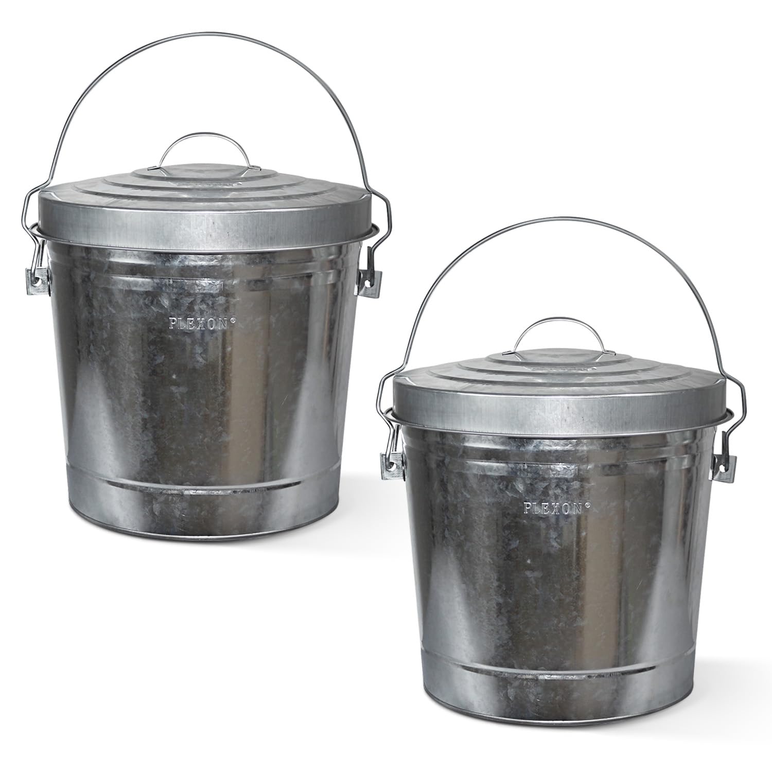 Plexon 6 Gallon Small Metal Trash Can with Locking Lid Galvanized Metal Bucket with Lid for Poultry Feed Bird Seed Storage Ash Outdoor Garbage Trash Bin 2 Pack