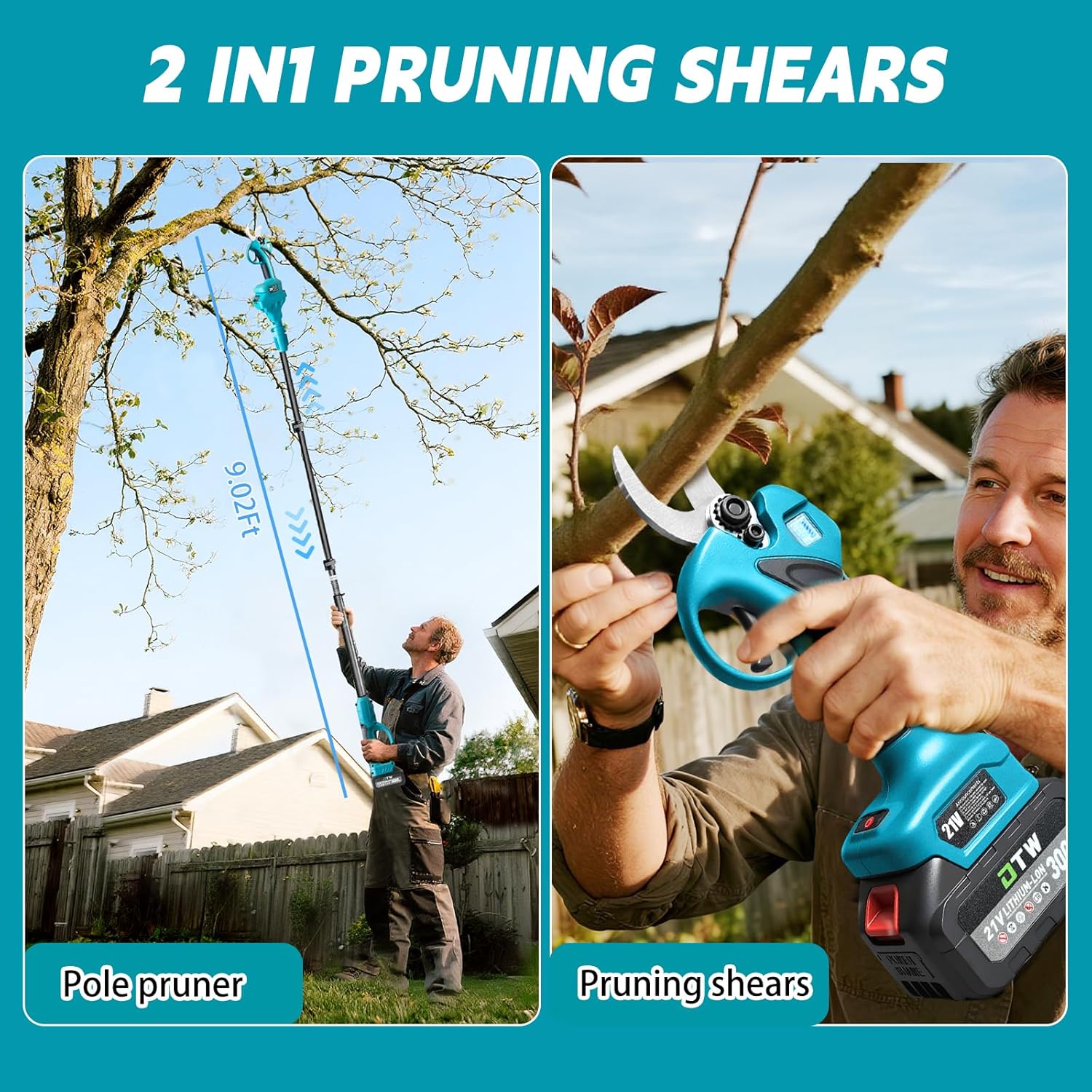 • 【Multiple adjustable Modes】Ground to sky trimming in one tool. With these Electric Pruning Shears, you can effortlessly switch between handheld mode (for low shrubs) and pole mode (extends 4.2 ft to 9 ft). Without a ladder, you can safely prune tall branches from the ground!