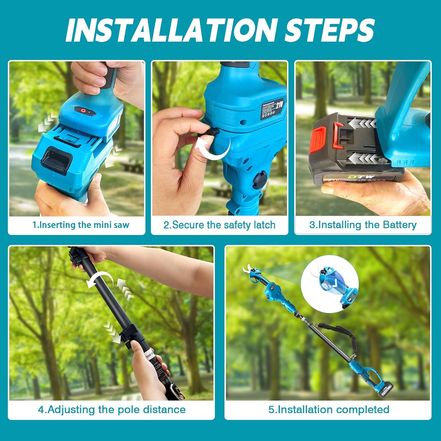 • 【Safety First with Dual】To start this electric pruning shears machine, first turn on the power switch and then quickly press the trigger twice when operating with the pole, you must press the safety button and the trigger simultaneously to safely prune thick branches.