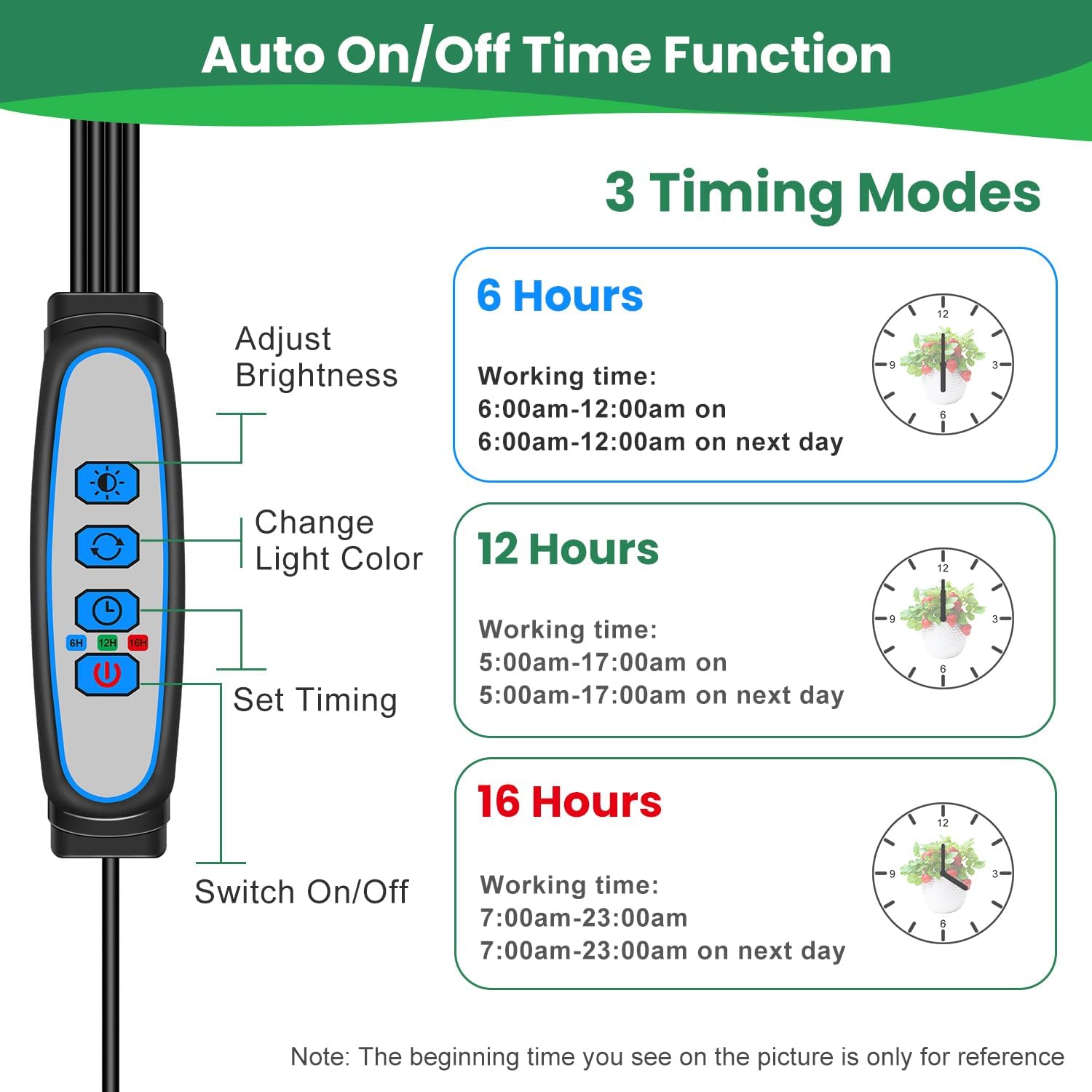 • [Auto On or Off & Precise Timer] The plant light with automatic memory timing function can be automatically turned on/off every day according to your settings (6H 12H 16H) requires no manual operation. The grow light will be convenient to take good care of your plants when you go out to work or on vacation