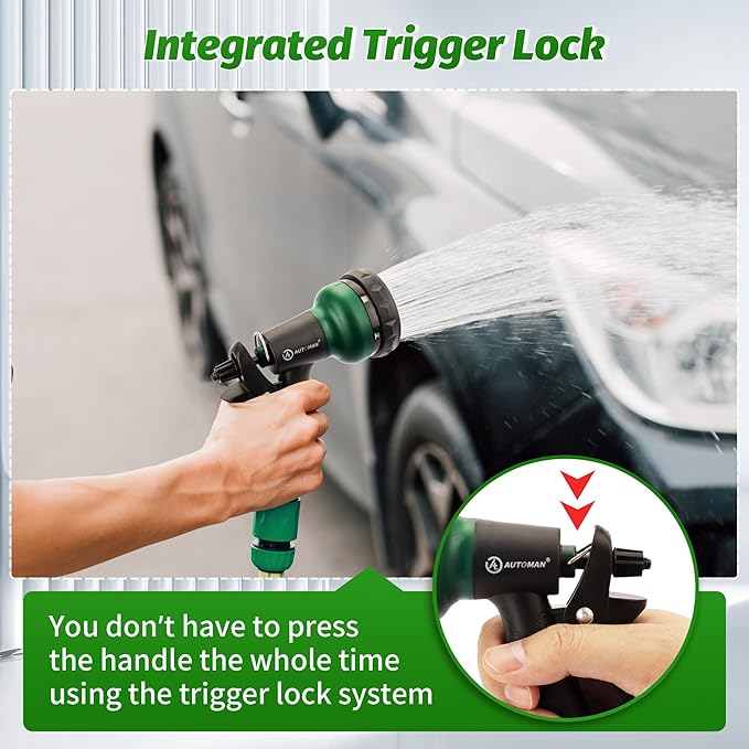 • Labor-Saving Design: AUTOMAN garden nozzle features a nice lock bar at the top of the handle that keeps the water remains on without you having to apply any pressure.Just use the lock so you don't have to keep your hand holding it the whole time.