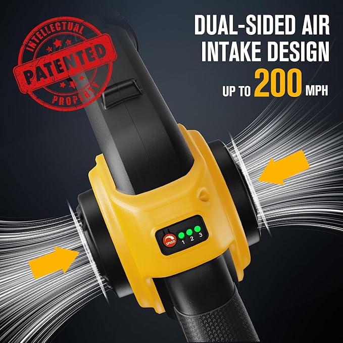 • [Patented Design Up to 200MPH] This small leaf blower cordless with patented design uses double-sided air inlet. It is lightweight and has a wind speed of up to 200MPH/130CFM. Ultra-high wind speed 200 mph leaf blower can easily remove those stuck and stubborn debris. 3 speeds Adjustment modes meet different usage scenarios according to your needs