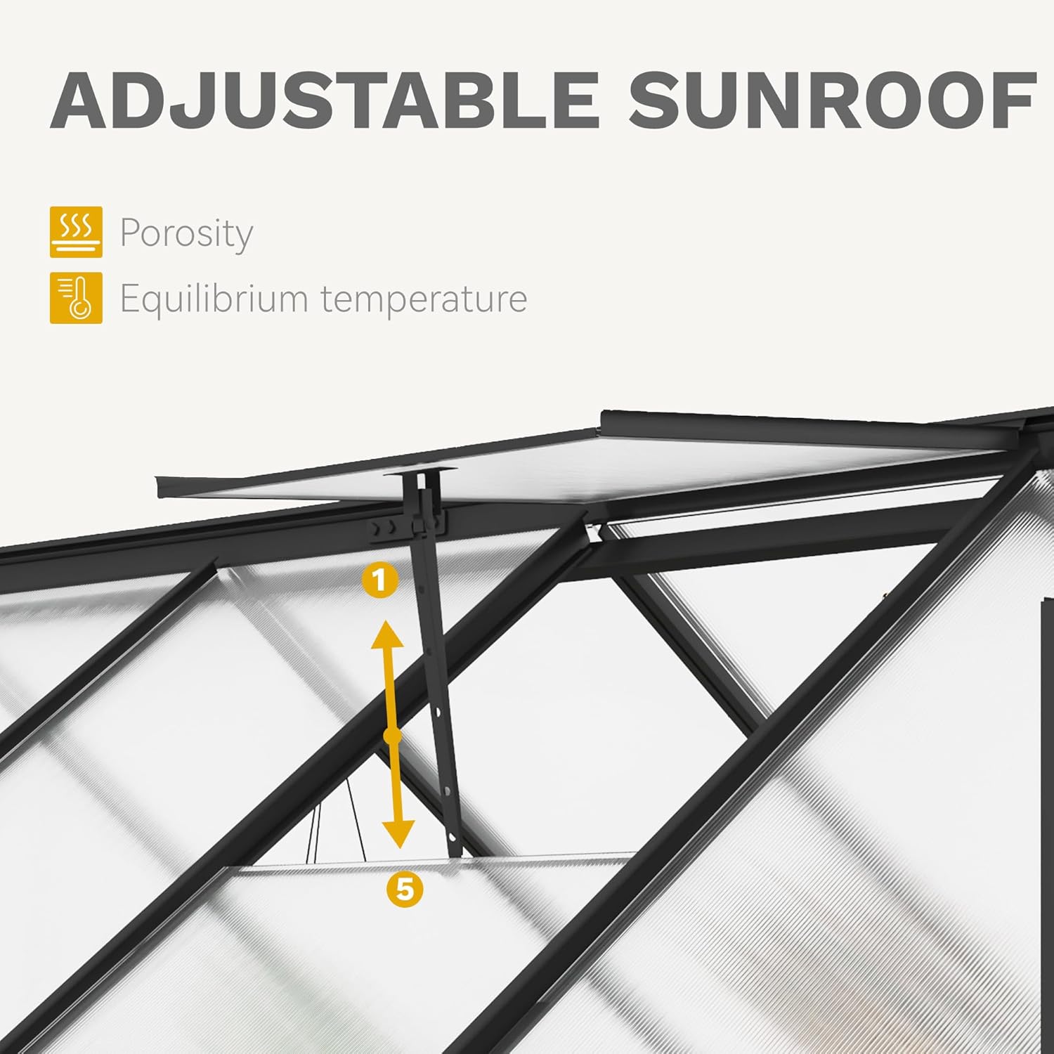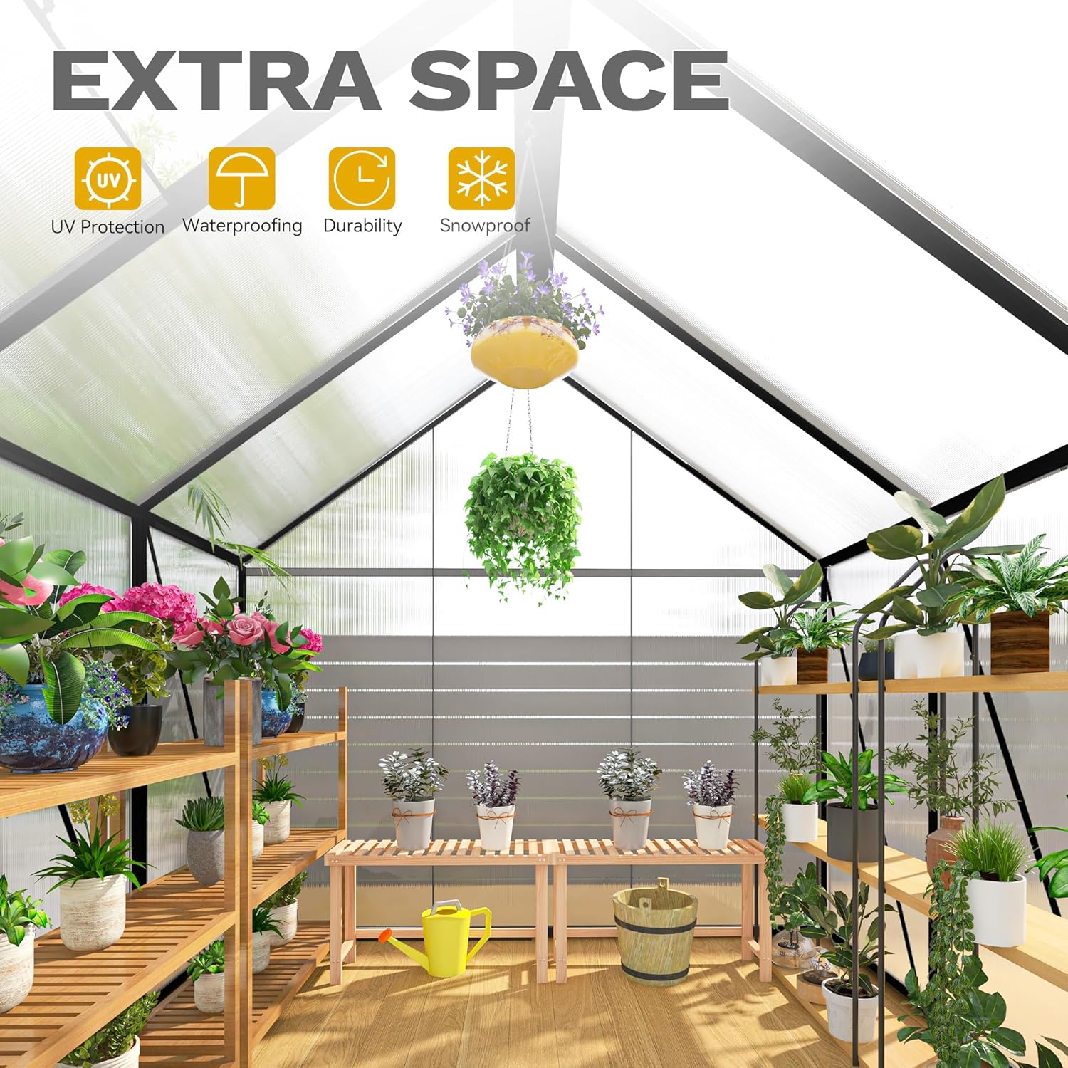 • UPGRADED MATERIALS- 6x8FT polycarbonate greenhouse is constructed using a reinforced aluminum alloy frame for enhanced sturdiness and load-bearing capacity; 4mm thick double-wall polycarbonate boards with UV protection, protect your plants and keep it in steady temperature