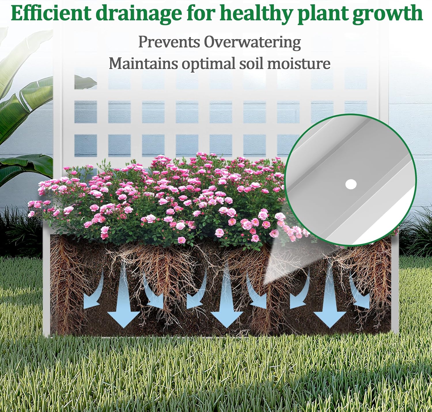 • Optimal Water Management: The planter with trellis features a deep planting bed, offering generous space for healthy root development. The raised garden bed also comes with built-in drainage holes that efficiently prevent water accumulation, helping your plants maintain proper moisture levels for optimal growth.