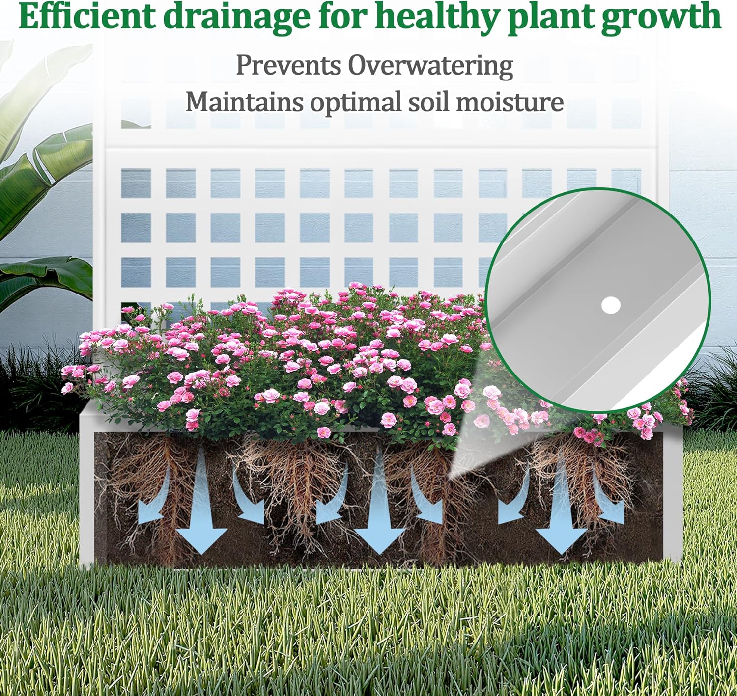 • Optimal Water Management: The planter with trellis features a deep planting bed, offering generous space for healthy root development. The raised garden bed also comes with built-in drainage holes that efficiently prevent water accumulation, helping your plants maintain proper moisture levels for optimal growth.