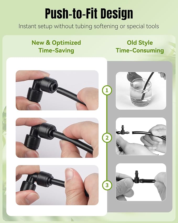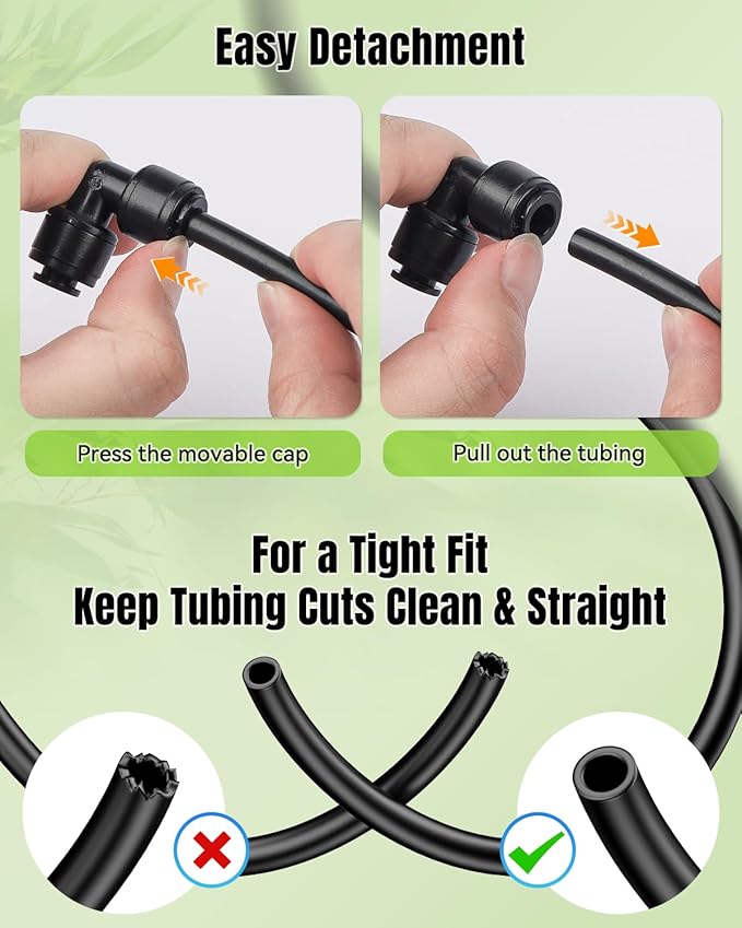 • Push-to-Fit Design: No tubing softening or special tools required! Simply push your tubing into the drip irrigation elbow connectors for an instant setup. To detach, just press the movable caps on the inlets and pull out the tubing