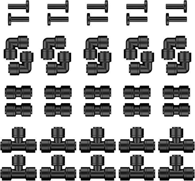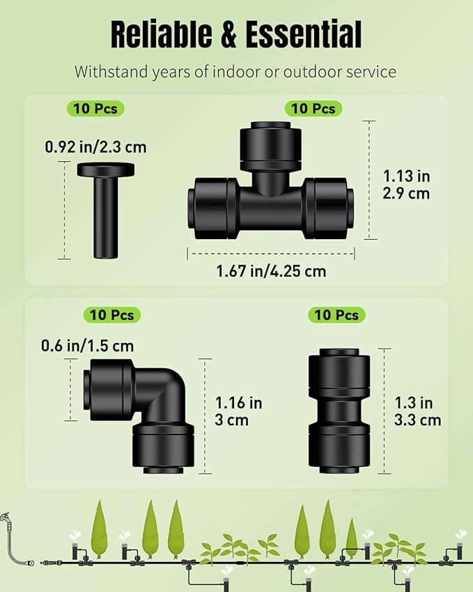 • Drip Irrigation Fittings Kit: Include forty 1/4-inch drip irrigation tubing fittings – 10 tee connectors, 10 straight couplings, 10 elbow connectors, and 10 end plugs. Made of weather-resistant plastic, they withstand years of indoor or outdoor service