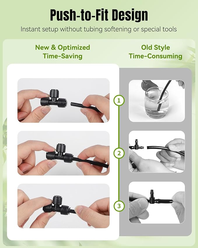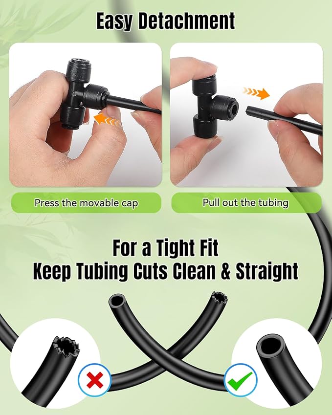 • Push-to-Fit Design: No tubing softening or special tools required! Simply push your tubing into the inlets of the drip line connectors for instant setup. To detach it, just press the inlets and pull out the tubing. Greatly save your time and effort