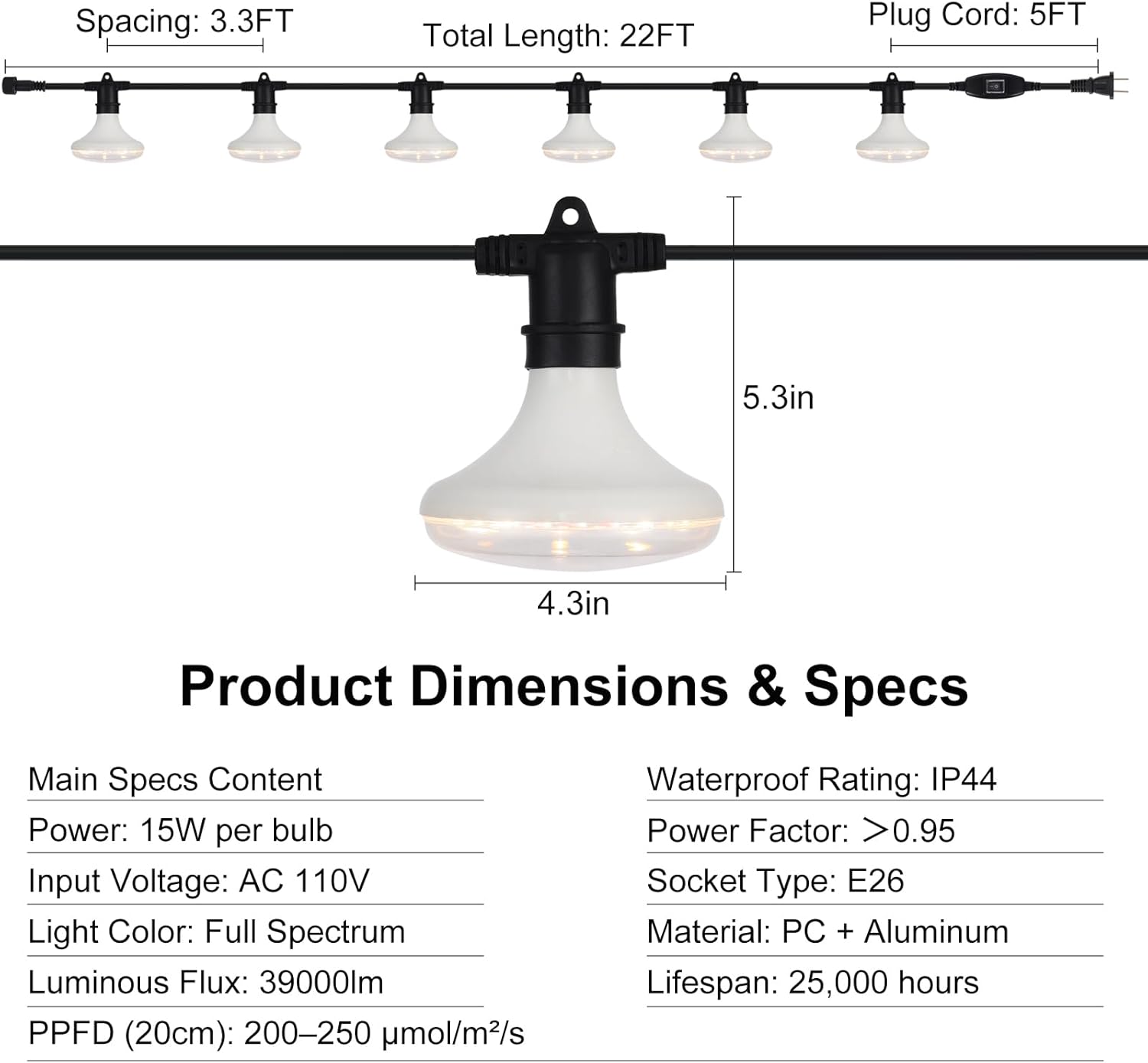 Outdoor Grow Lights Waterproof, Full Spectrum String Grow Light with 22FT Light String Cord for Seedling, Veg, Flower in Greenhouse, Garden, Backyard, Farm (6 Lights, with Smart Plug)