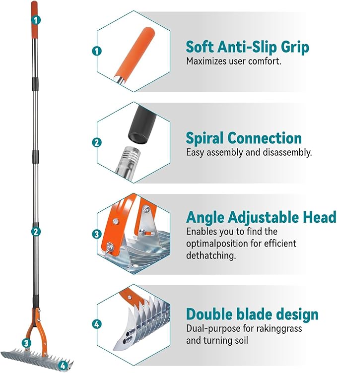 • 【70’’ Long Section Handle】The dethatching rakes handles are made to screw together in smooth metal, with different length options. This feature of the metal rake heavy duty allows you to use the lawn rake for different purposes and adapt it to your height. The yard rake also has a non-slip texture, which makes it comfortable to hold, enhances grip and prevents accidents.
