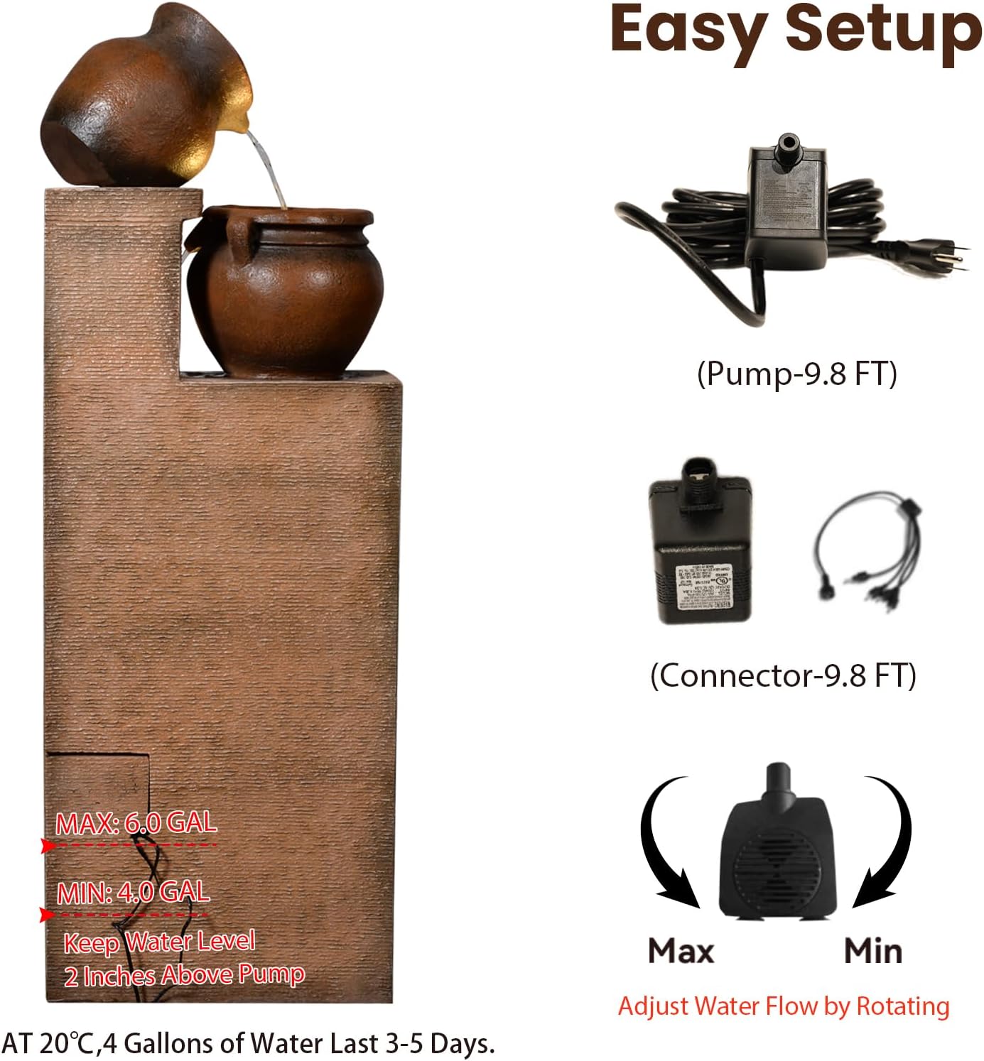 • SIZE & PACKAGE: The 18.5"L x 14.6"W x 53"H tall water fountain package includes: patio water fountain (39 lbs)1, transformer with 9.8 ft power cord*1, pump*1, and instruction manual*1. The outdoor fountain and waterfall are easy to set up, maintain, and clean — an excellent choice for decorating your outdoor living space