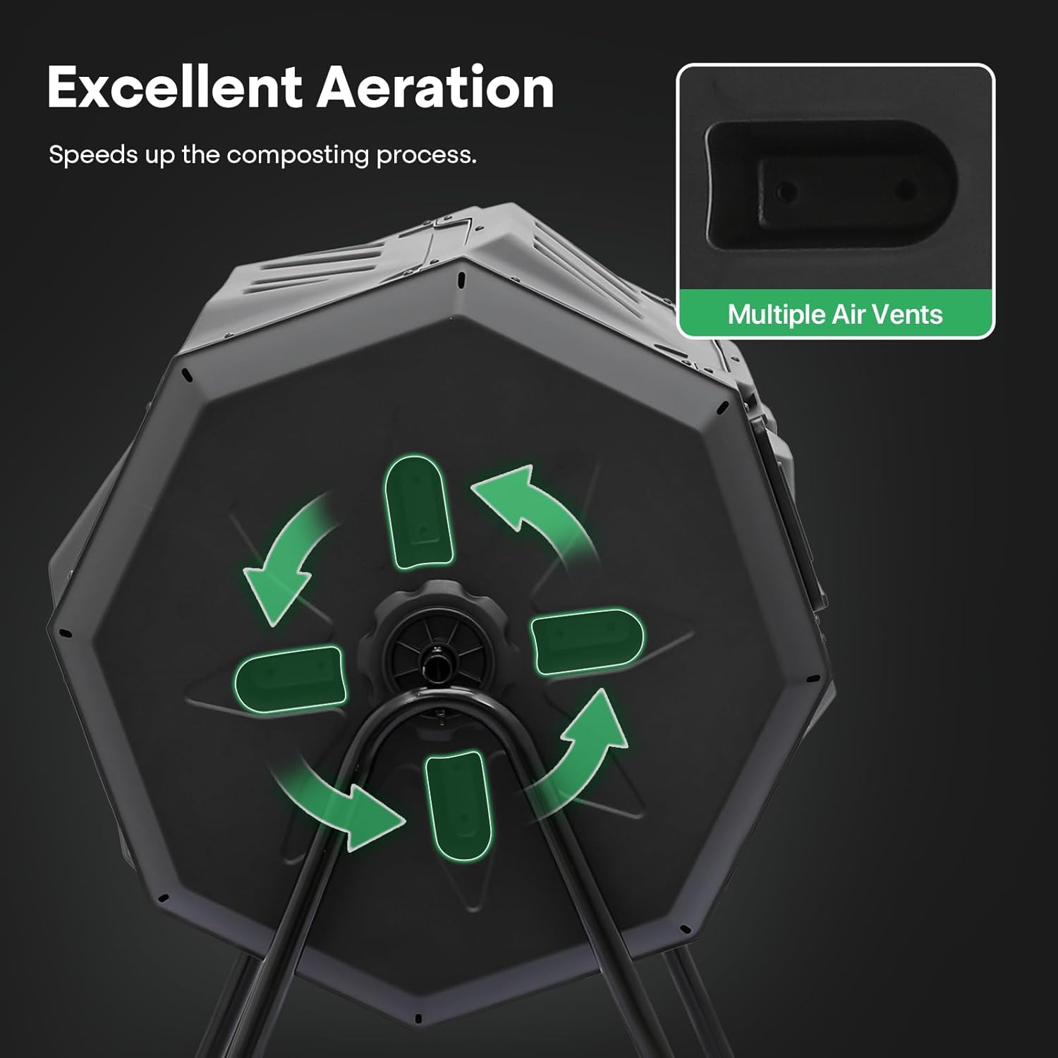 • Improved Air Circulation System: Integrated air vents and internal mixing fins improve airflow and help maintain an ideal balance of moisture and oxygen, which accelerates decomposition and keeps odors in check.